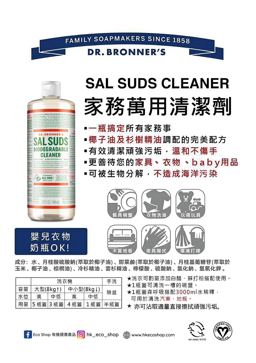 所有家庭必備的萬能清潔劑,Bronner 博士有機 SAL SUDS 萬能清潔劑非常適合清潔餐具、地板,甚至洗衣服!這款濃縮的有機產品含有天然衍生表面活性劑與純冷杉和雲杉精油的平衡配方,能以非凡的力量清潔和沖洗,同時對皮膚溫和。