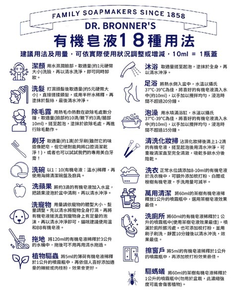 ‧ 18合1的多用途濃縮型皂液,用途廣泛幾乎適用於任何家居或個人護理的清潔任務